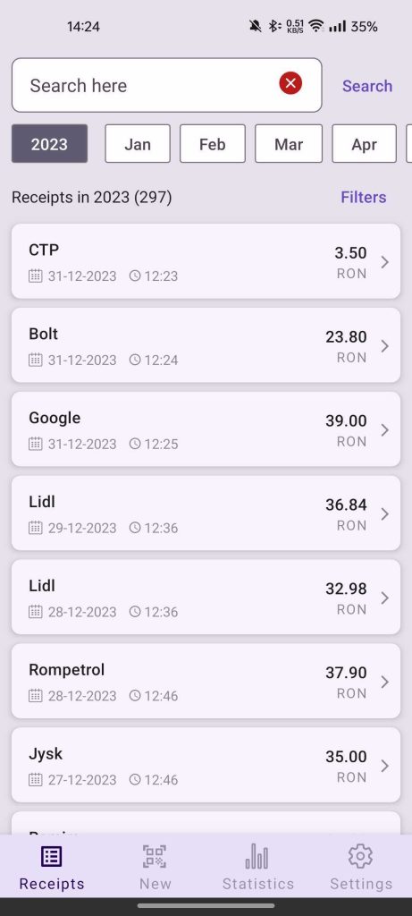 The app allows users to scan physical receipts, automatically extract product information, and store the data locally. Users can then search for specific products or analyze spending trends through built-in statistics and summaries.